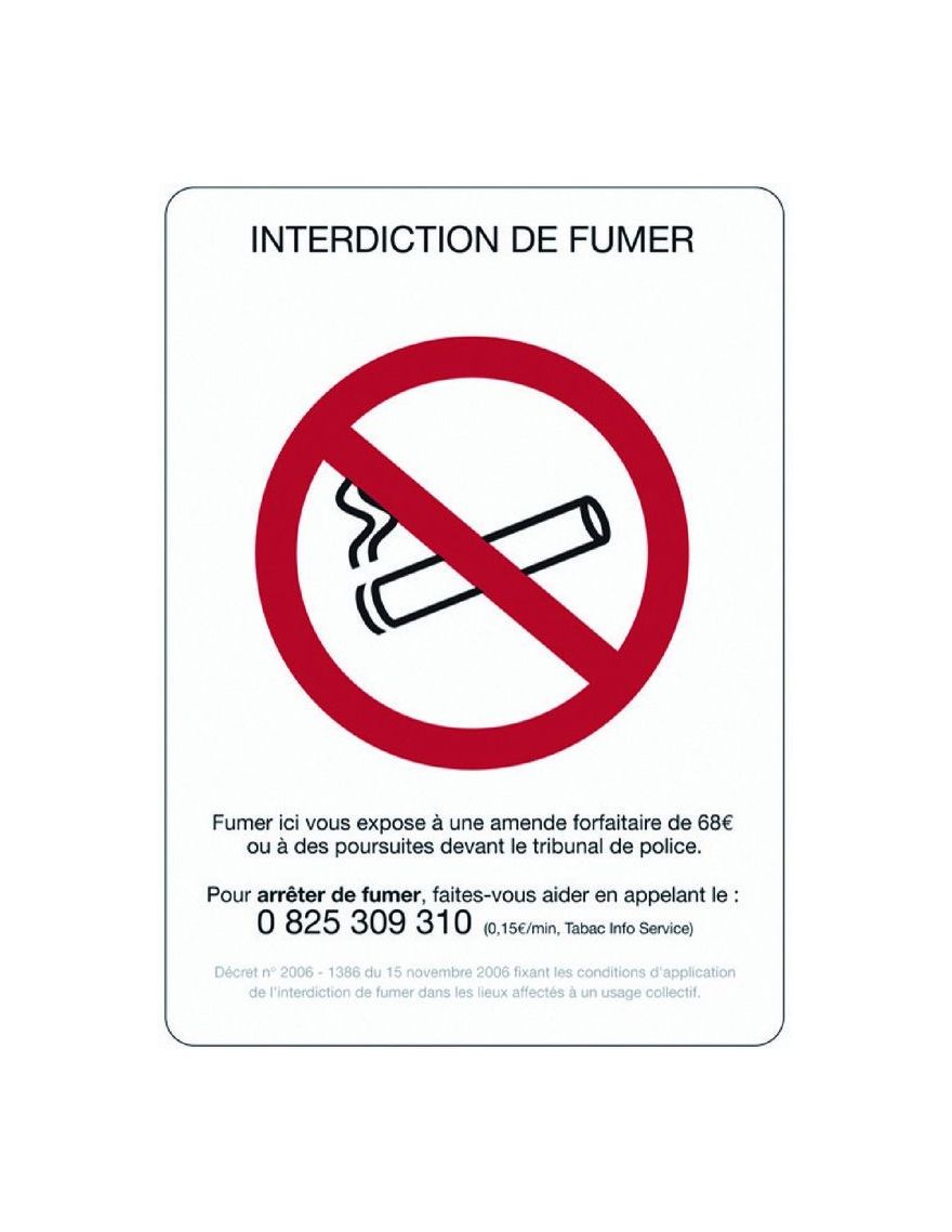 Panneau de signalisation PVC « Interdiction de fumer » Taliaplast. Ce panneau mesure 210x297 millimètres. Pour indiquer l'interdiction de fumer, sur le lieu de travail, le service à contacter pour arrêter, et les informations en cas de non respect.