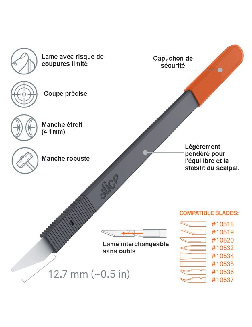 Le scalpel SLICE 10568 à lame interchangeable en céramique est équipé d'un manche mince et plat (de 4,1 mm d'épaisseur seulement, sans son capuchon) capable de pénétrer dans les espaces restreints et comprend une lame interchangeable 10518 Finger-friendly® (tranchant droit à bouts arrondis).