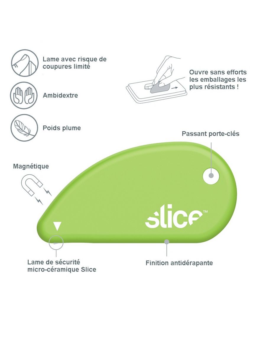 Les lames céramique Slice® sont issues d’un procédé de fabrication exclusif qui leur permet d’avoir un contact sûr avec la peau (faible risque de coupures) tout en étant capable de trancher efficacement différents matériaux.