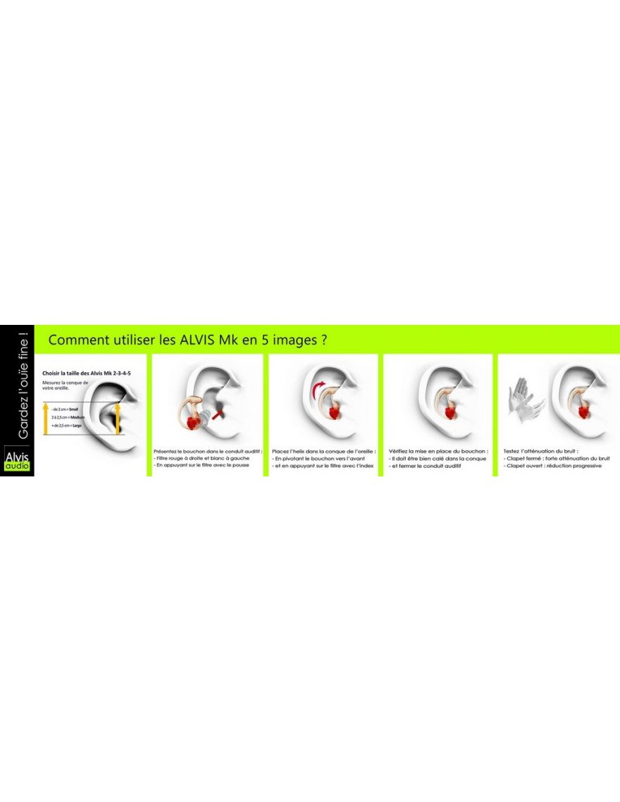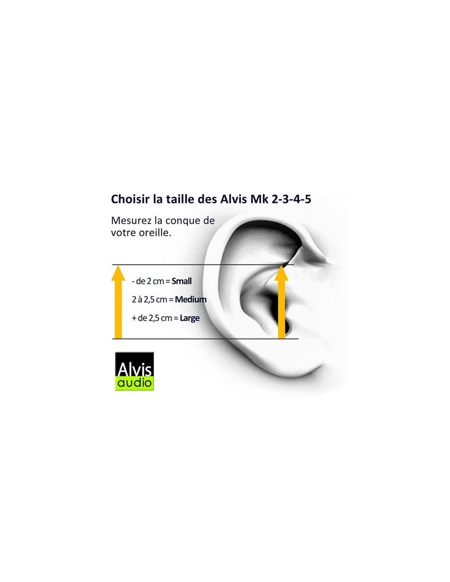Alvis Mk 4, avantages : Atténuation renforcée sur les fréquences aiguës : + 3dB d'atténuation rapport au Mk3 (soit un peu plus du double) sur les fréquences dangereuses pour l'audition. Très bonne précision auditive en position ouverte, 2 niveaux d'atténuation (forte ou très forte) grâce au clapet de fermeture, Filtrage efficace des sons sans les déformer : très bonne compréhension de la parole humaine, Atténuation renforcée sur les aigus pour les activités très sonores, Mise en place très simple et rapide, Excellent maintien dans l'oreille, Super confortable, pour être porté toute la journée, Disponible en 3 tailles. (voir schéma au niveau des visuels du produit). Livrés avec une boite de rangement.