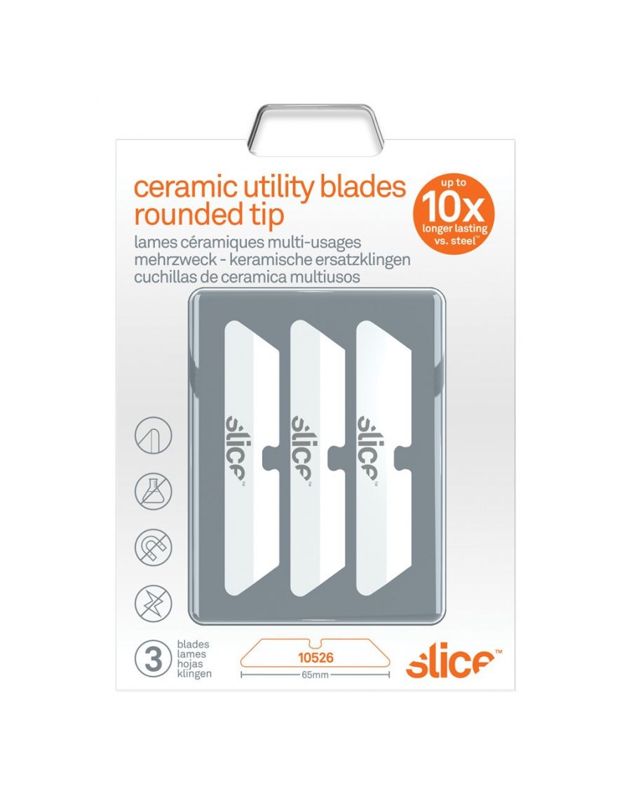 Lame céramique de rechange bout arrondi. Compatible avec les cutters Slice : Utility 10550, 10554, 10558, Folding Utility Knive 10562, Utility Scraper 10591, 10593, Manual Carton Cutter 10585, Longcut Ceramic KL00110CER (modèle Knifeline).