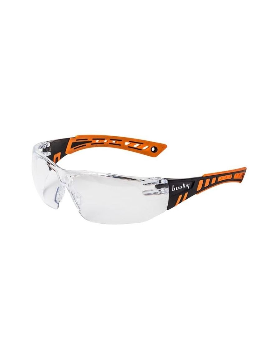 Découvrez ces lunettes de sécurité en polycarbonate sans monture, dotées de branches souples co-injectées orange et noires et de verres transparents. Vision panoramique, antiglisse, traitement anti-buée et anti-rayures.