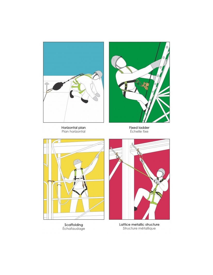 - Absorbeur d’énergie en sangle largeur 44 mm afin d’avoir un impact en cas de chute inférieur à 6 kN