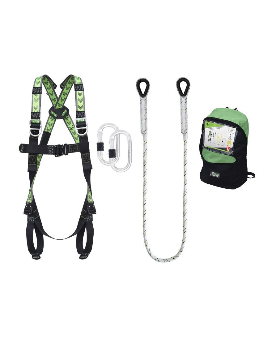 Kit de maintien comprenant : 1 harnais KRATOS FA1011100 3 points d'accrochage (un dorsal, 2 latéraux thoraciques), 1 longe de maintien de 1.8 m FA4050020, 2 mousquetons à vis FA5010117 ouverture 17 mm, 1 sac 12 LITRES à dos FA9011500.