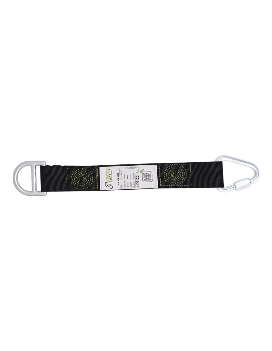 La sangle d'extension amovible avec dé d'accrochage Kratos permet de prolonger le point de connexion dorsal du harnais grâce à une fixation directe via un maillon. D’une longueur de 40 cm, elle facilite l'accès au point d'ancrage sans modifier l'équilibre du technicien.