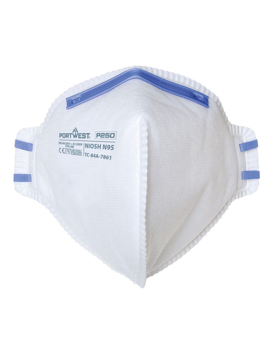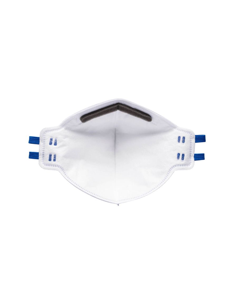 Masque jetable FFP2 sans soupape. Masque plat confortable à pliage vertical. Sangles pour la tête soudées par ultrasons. Rembourrage en mousse autour du pont nasal. Pont nasal réglable pour réduire la buée sur les lunettes.
