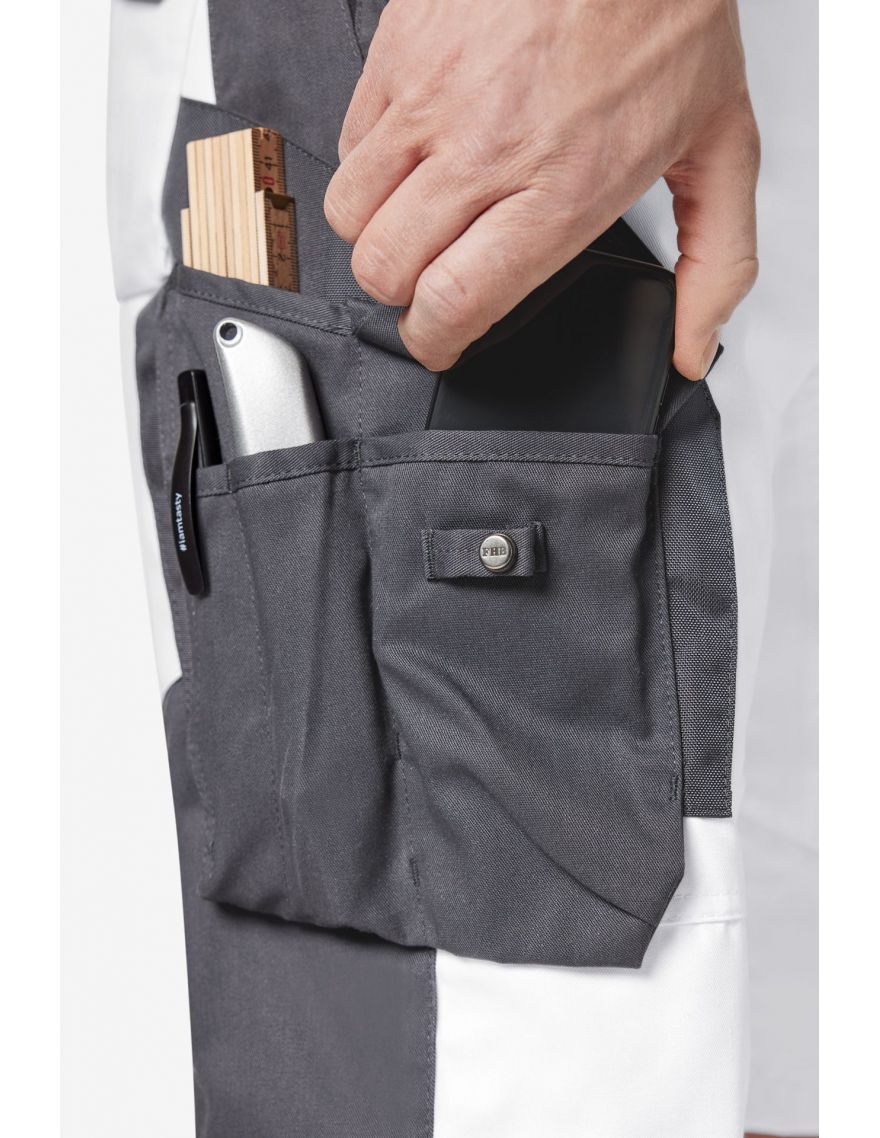 Le pantalon de travail multipoches FHB - FLORIAN est fabriqué dans un mélange de coton et de polyester, et garantit une liberté de mouvement grâce à des zones latérales élastiques.