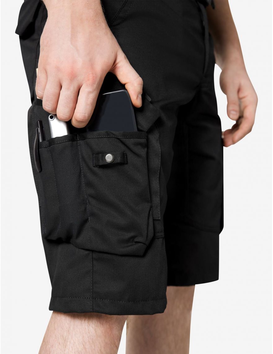 Pensé pour les métiers qui utilisent différents outils, ce bermuda dispose de nombreuses poches fonctionnelles. À gauche et à droite, une poche est conçue pour un téléphone portable et un mètre pliant. De plus, des compartiments complémentaires pour crayon, cutter ou couteau sont intégrés sur le côté gauche, avec un accès rapide.
