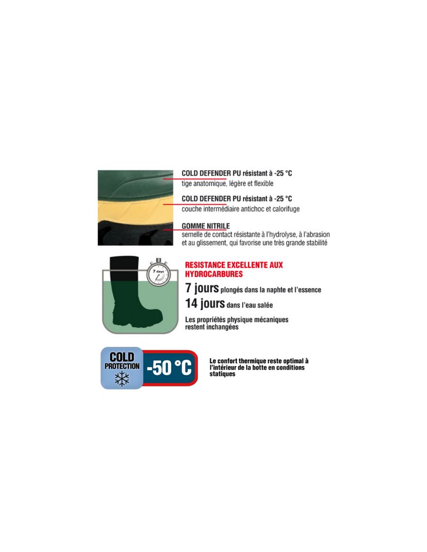 La tige et la semelle intermédiaire sont fabriquées en Cold Defender PU, un matériau antibactérien résistant aux températures jusqu'à -25 °C. Avec une semelle d’usure en gomme nitrile, ces bottes sont conçues pour supporter des températures extrêmes et offrent une résistance à la chaleur jusqu'à 300 °C (en contact pendant une minute).