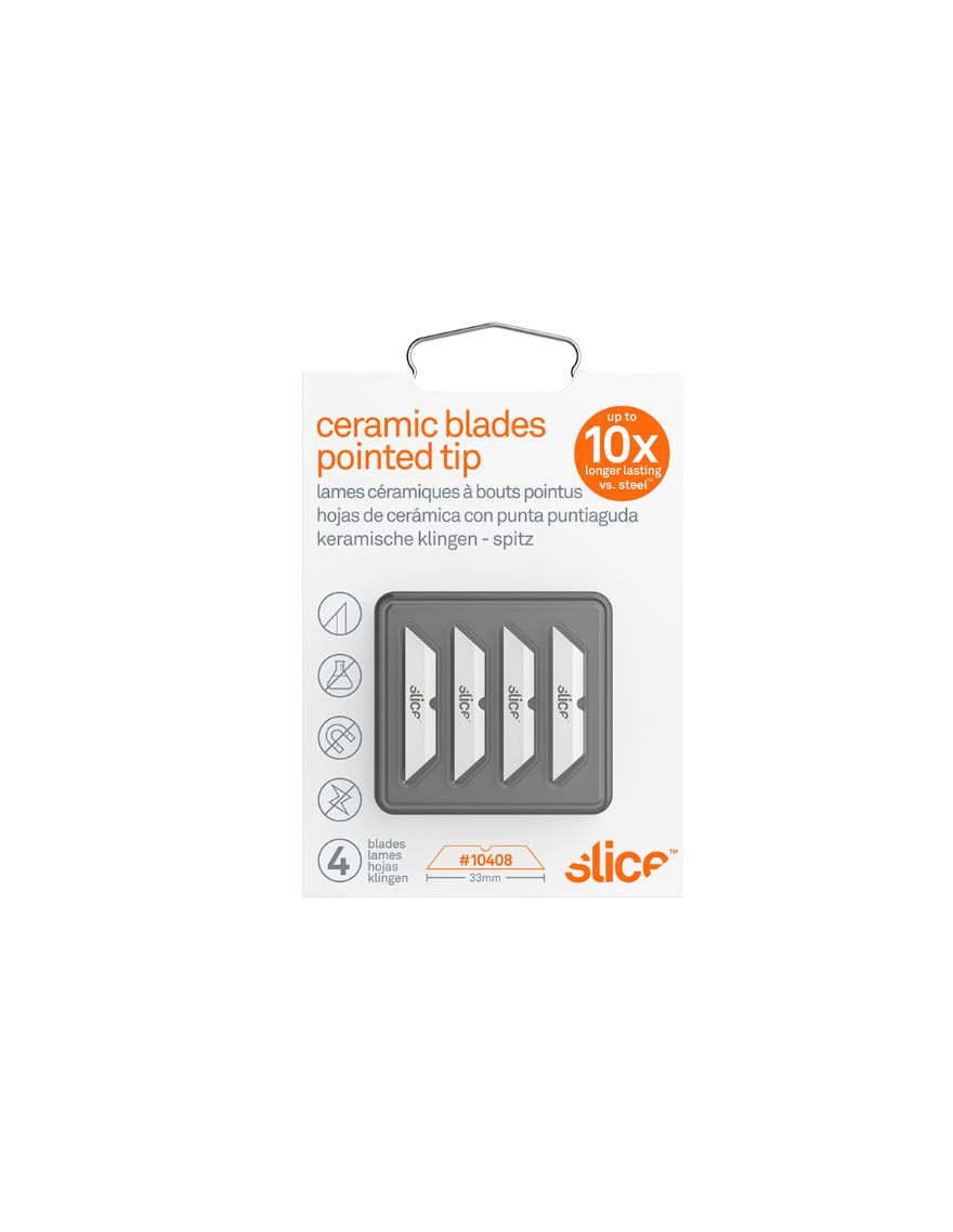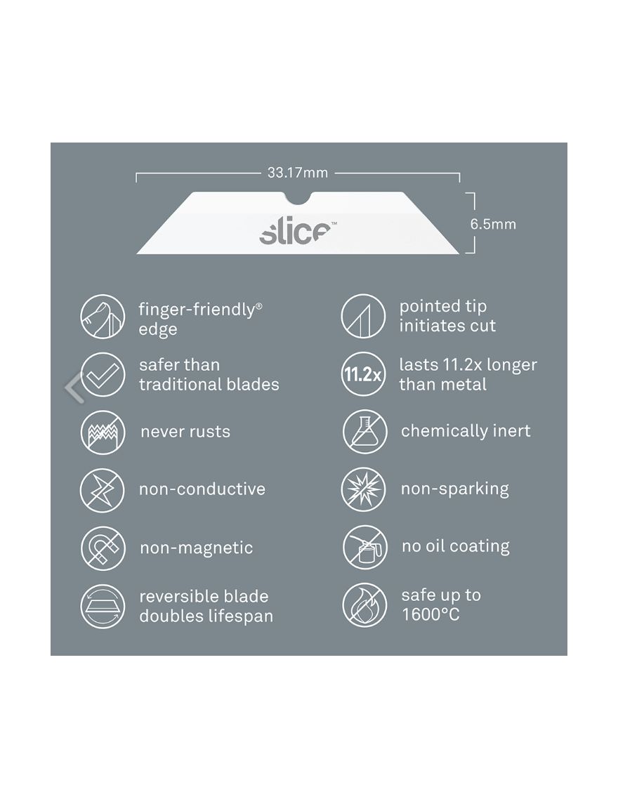 La lame de rechange SLICE 10408 de haute technologie double-sens est aiguisée à la main, et reste aiguisée 10x plus longtemps qu'une lame acier. Elle dispose d'un bout pointu pour les applications qui nécessitent une action de perçage pour initier la coupe.