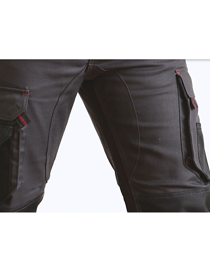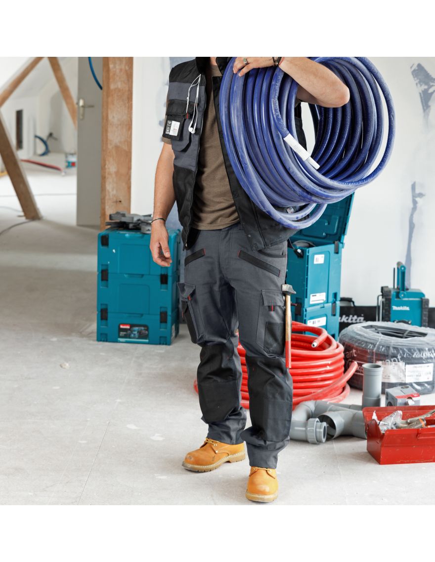 Pantalon de travail poches genoux de la marque LMA modèle Argile en bicolore Gris/Noir offre une capacité de rangement pratique et des fonctionnalités optimisées pour le confort et la durabilité. Des poches stratégiquement placées,  dont deux poches western, complétées par une poche ticket et deux poches zippées, offrent un espace de rangement sécurisé pour les objets de valeur. De plus, une poche pour le mètre et une poche à stylo complètent les options de rangement. Des poches genouillères en Oxford 900D,  imperméable et résistant, deux positions ajustables, offrant la possibilité de régler la hauteur.
