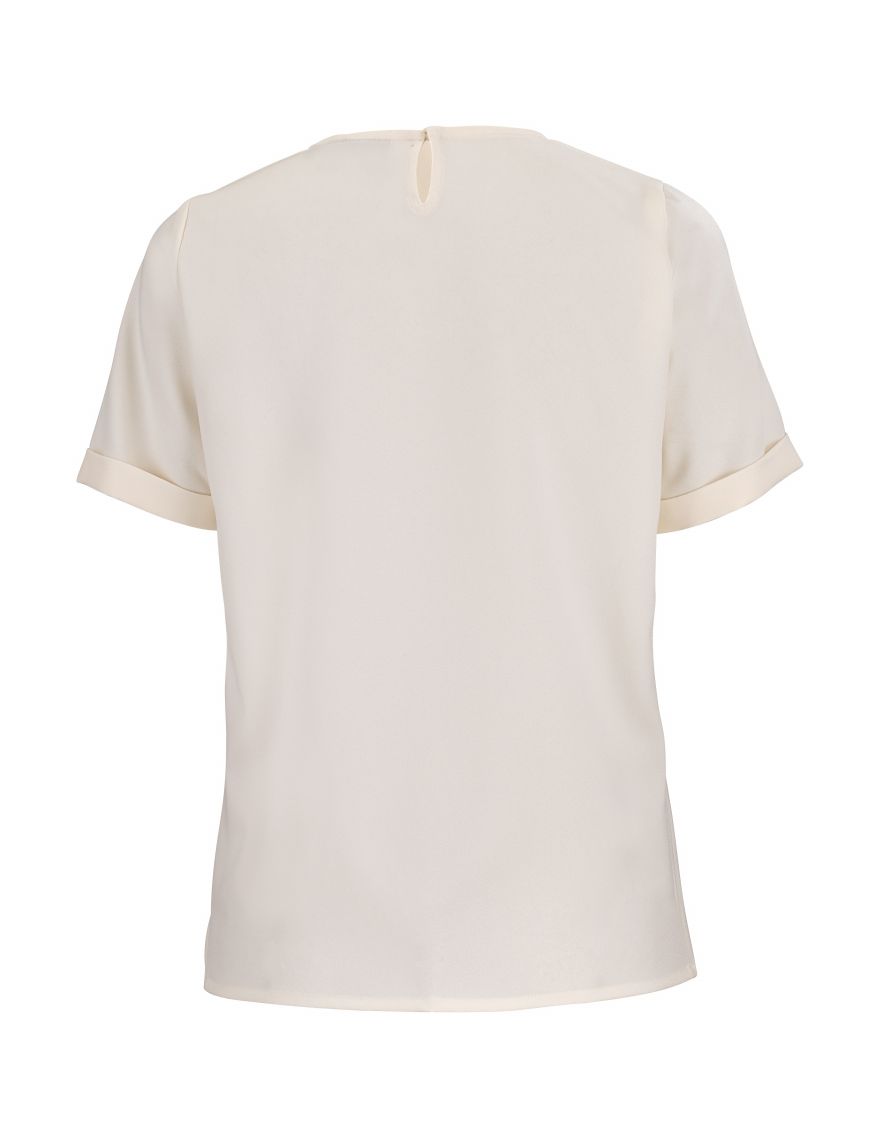 Ses manches courtes, agrémentées d’un délicat petit revers, ajoutent une touche d’élégance à ce modèle intemporel. L'encolure ronde met en valeur le cou, et le décolleté dans le dos (rehaussé d'une élégante petite goutte) apporte une note de féminité.