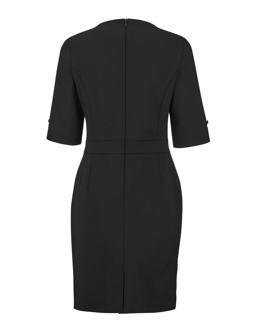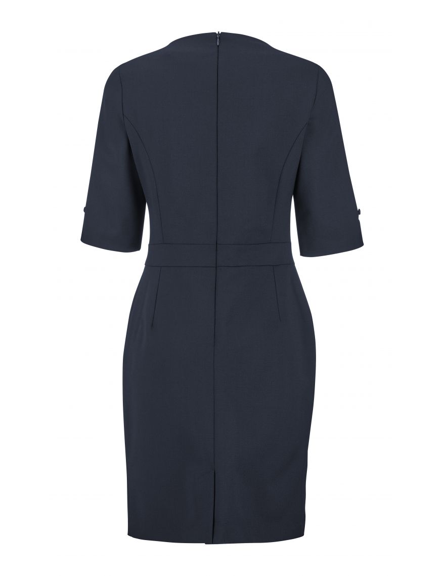 Son intérieur satiné au niveau des manches apporte une touche de confort. Le faux portefeuille, orné de boutons et de boutonnières, permet une finition soignée et professionnelle. Le zip invisible sur le côté assure une fermeture fluide et discrète, idéale pour un enfilage rapide. Les pinces et les découpes princesses offrent une silhouette structurée et féminine.