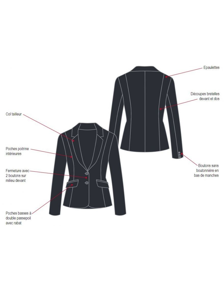 Cette veste tailleur se différencie par ses épaulettes sophistiquées structurant la silhouette, et son col tailleur classique apportant une touche de raffinement. Pour plus de praticité, cette coupe tailleur possède deux poches poitrine intérieures, idéales pour glisser vos affaires, et de poches basses à double passepoil et rabat, qui allie fonctionnalité et style.