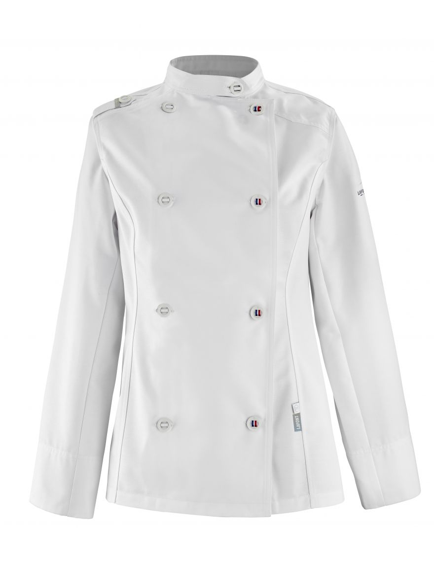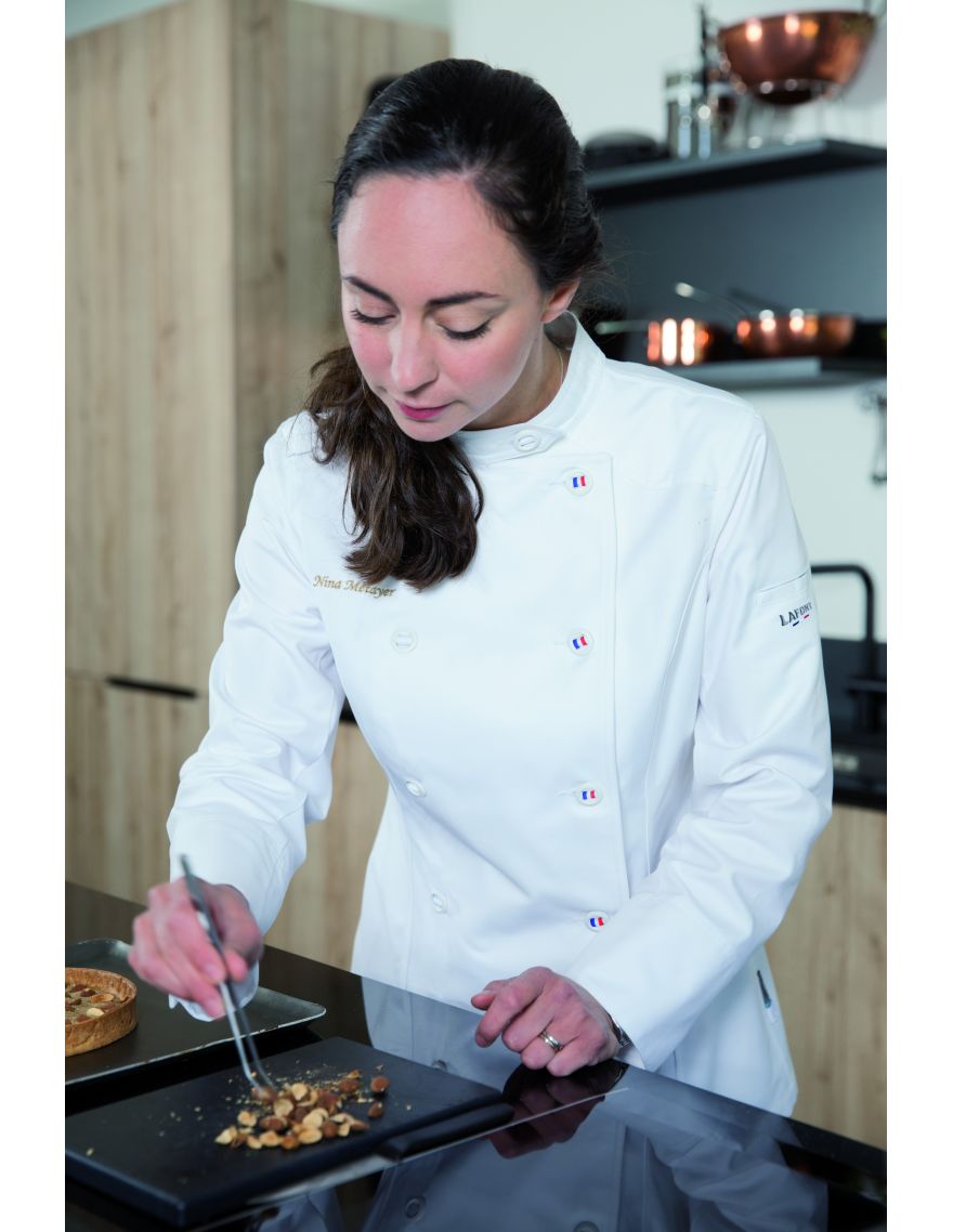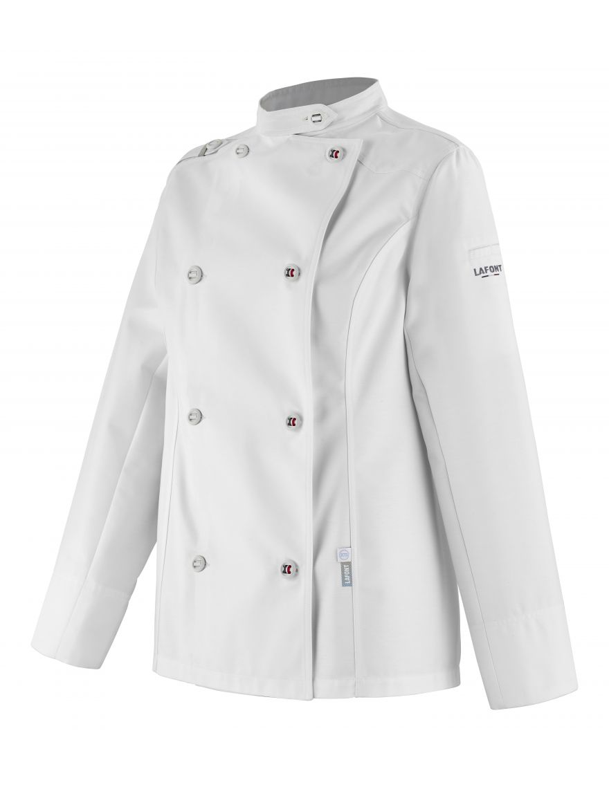 La veste de cuisine pour femme Lafont - 27CANOPEEF est pensée pour allier confort, praticité et style. Confectionnée avec des matériaux de qualité, elle se différencie par ses détails réfléchis : un système de boutonnage alternable, des boutons en bio-résine fixés par un galon en polyester recyclé, et une broderie en fil recyclé ornant l’épaule et l’intérieur du poignet droit. Sa coupe cintrée, accentuée par une découpe au dos et un pli plat central, assure une silhouette féminine et un confort optimal en toute situation.