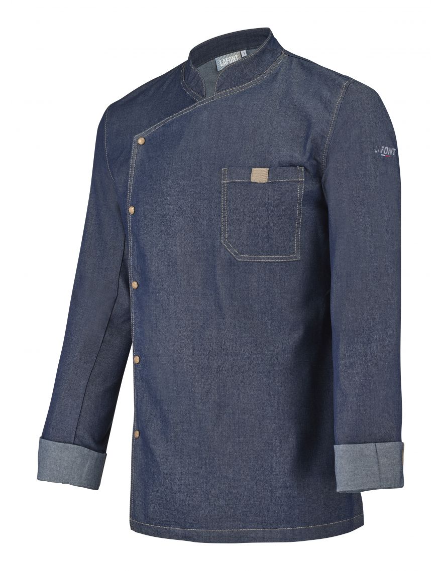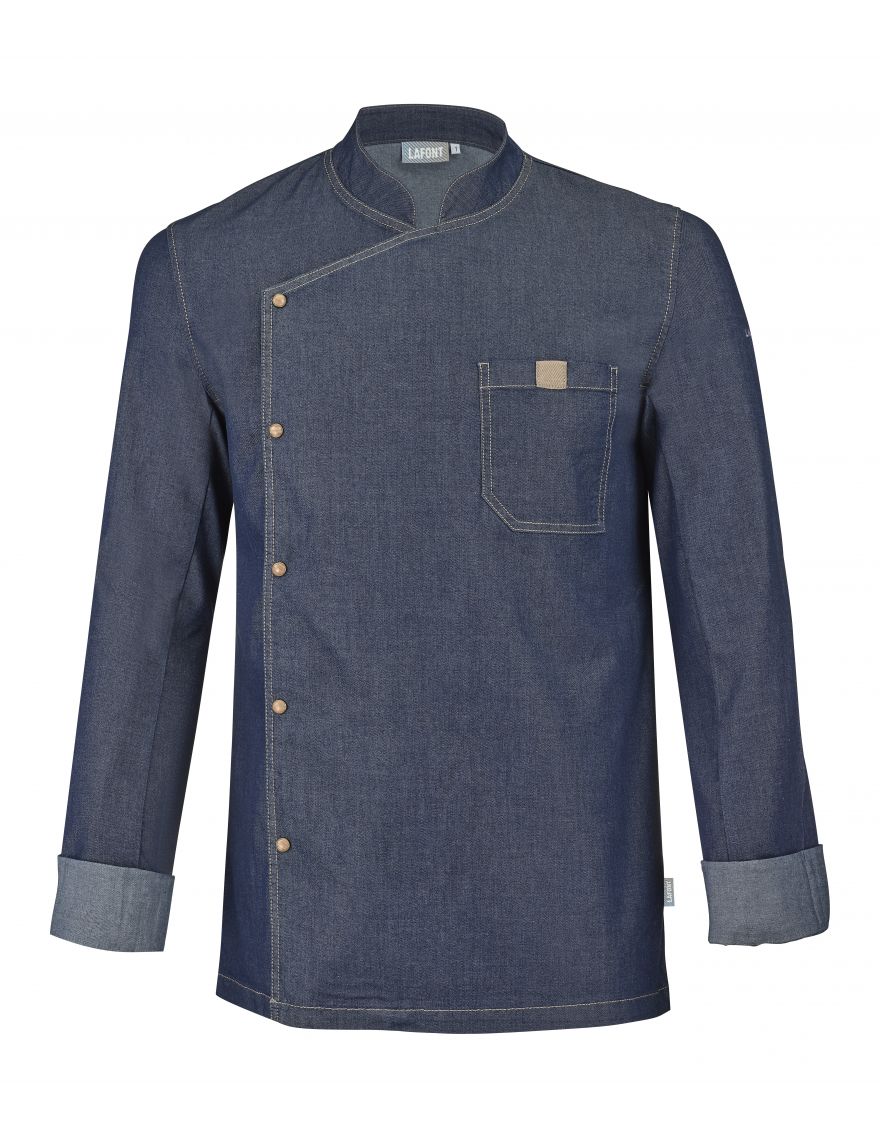 Elle se différencie par son effet de contraste au poignet grâce à l’envers du jean, et par la broderie bleue, blanche et rouge “LAFONT” sur le haut de la manche gauche, symbole de la qualité de la marque. Disponible dans différentes tailles, elle s'adapte à vos besoins professionnels. Elle est idéale pour les chefs et les cuisiniers en quête de confort et de style. Ajoutez dès maintenant cette veste de cuisine pour homme Lafont !