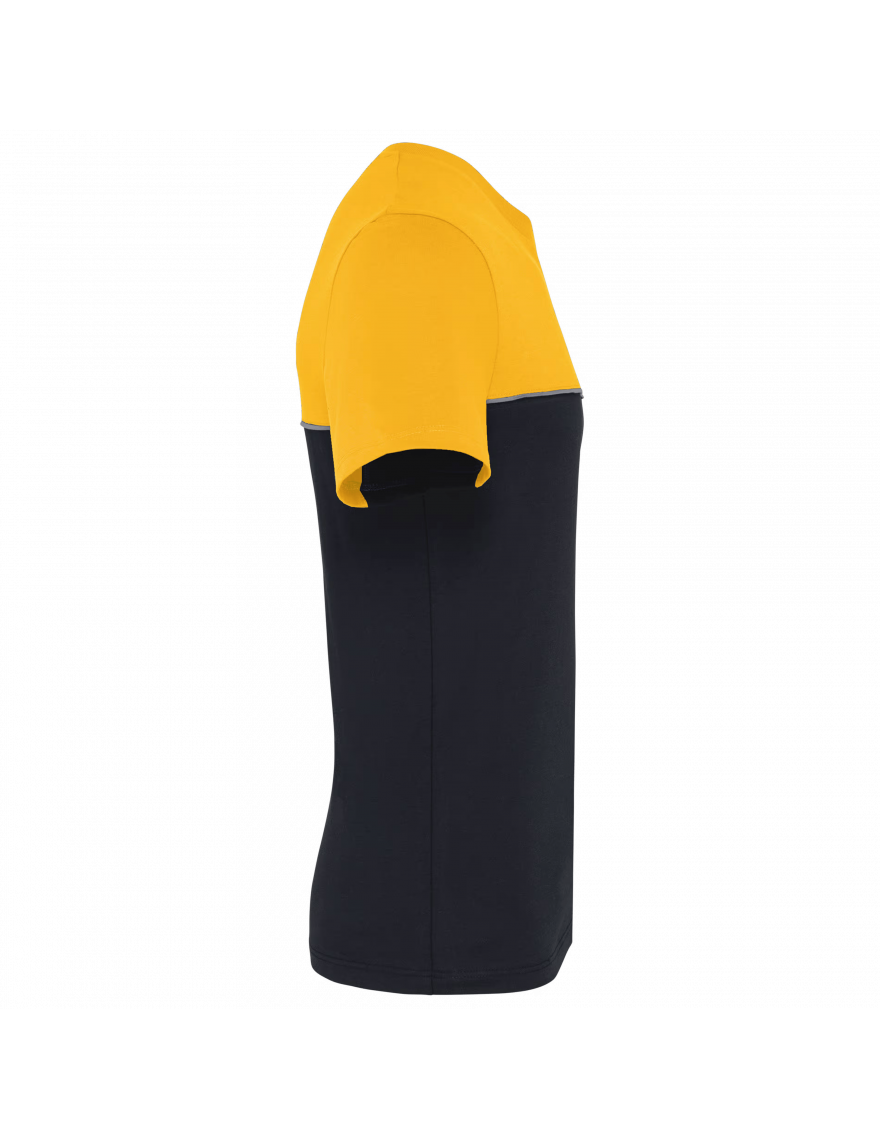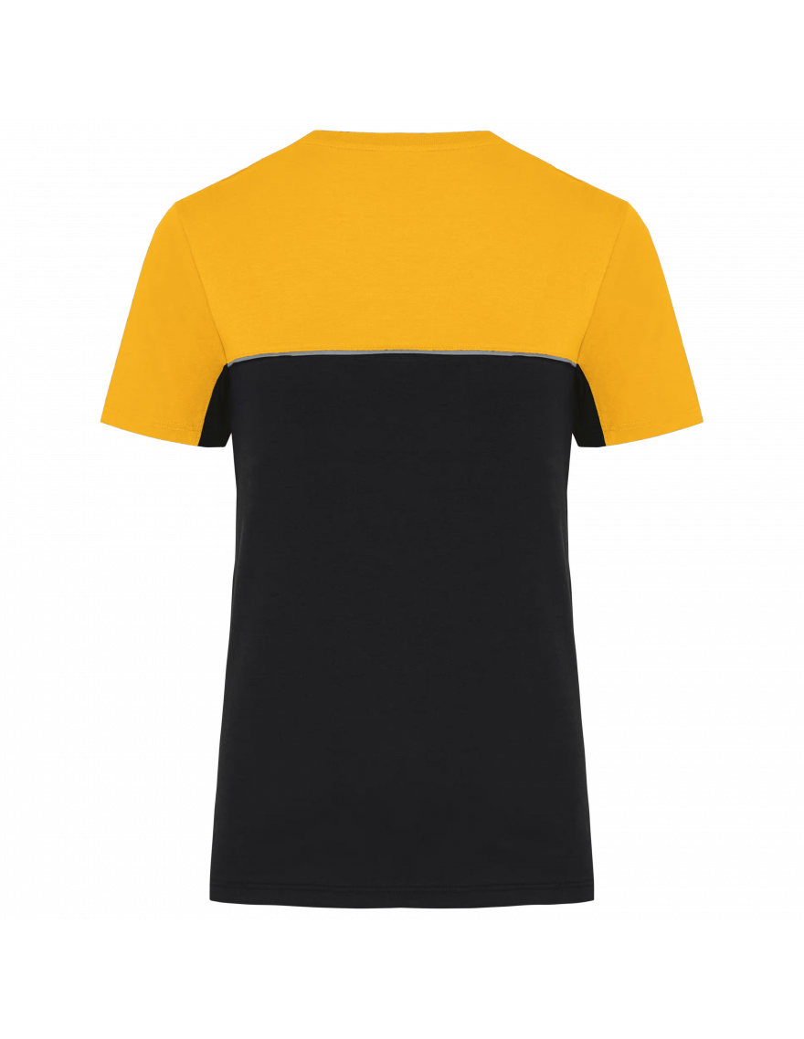 Sa coupe ajustée met en valeur la silhouette, avec une encolure ronde en bord-côte élastiqué pour plus de souplesse. Le passepoil contrasté souligne les zones bicolores à l’avant, à l’arrière et sur les côtés, tandis que la bande de propreté en chevron vient renforcer l’intérieur du col. Les finitions double aiguille aux manches et à la base assurent une belle tenue du vêtement.