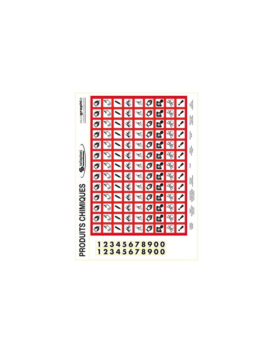 Planche de 104 pictogrammes. Intitulé et contenu : Pictogrammes produits dangereux. Matière : adhésif. Dimensions : Format de la planche : 220mmx300mm. Format des pictogrammes : 20mmx20mm.
