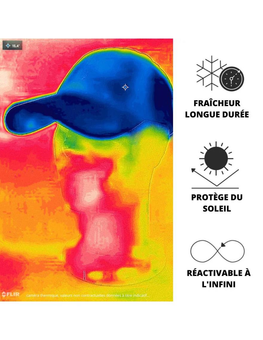 Casquette rafraîchissante G-Heat. Une simple activation et la zone frontale de refroidissement commence à diffuser une sensation de fraîcheur. Anti-UV, elle vous accompagne lors de vos expositions au soleil. Activable et réactivable à l’infini !